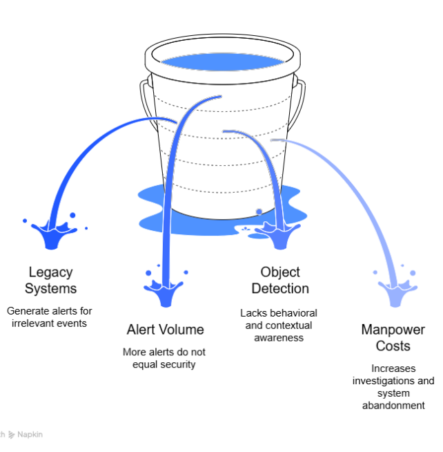 Legacy CCTV and motion-detection systems were designed to detect movement, not intent. As a result, they generate alerts triggered by shadows, weather conditions, animals, lighting changes, and routine human activity.